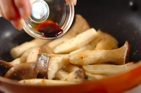 3、焼き色がついたらしょうゆを加え、全体にからめて器に盛る。
