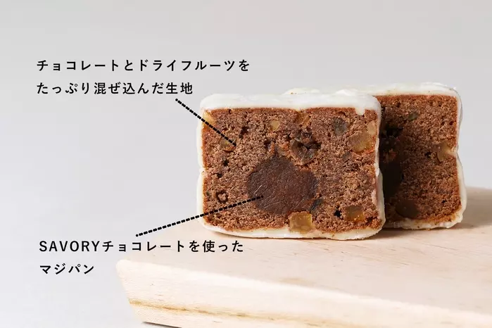 カカオ由来のフローラルやスパイスの香り豊かなチョコレートと、オレンジやレーズンなどのドライフルーツをたっぷりと混ぜ込み焼き上げた、シュトーレンのようなガトーショコラです。最初はチョコレートやドライフルーツの酸味や甘味をはっきりと感じることができ、時間が経つと馴染んで深みのある味わいに。