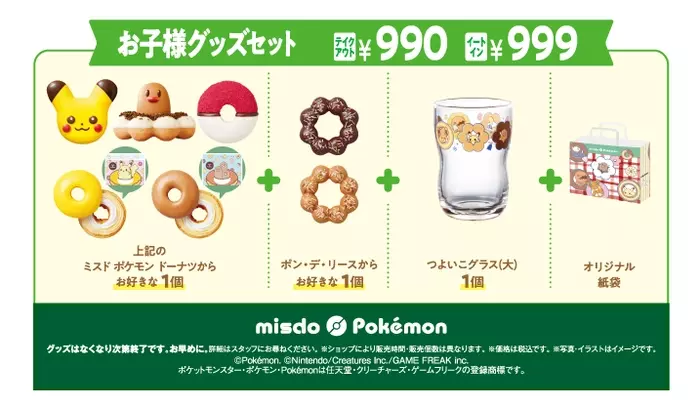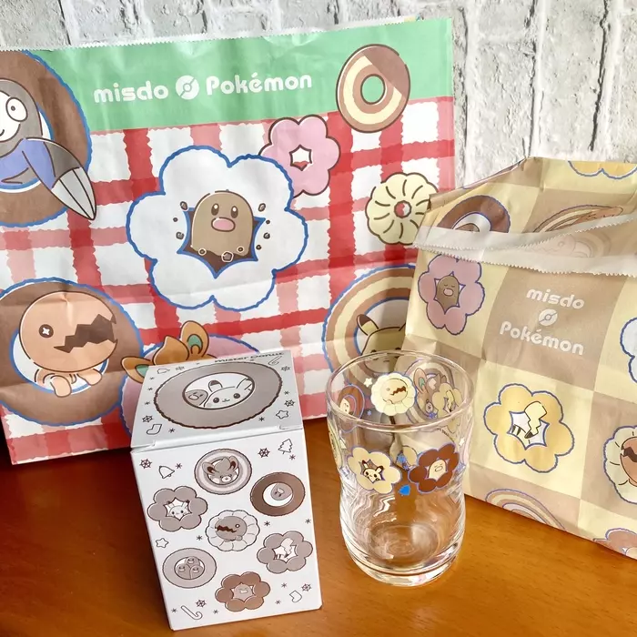 お子様グッズセットには、ポケモンドーナツの中から1つ、ポン・デ・リースの中から1つ、計2つのドーナツに、つよいこグラスが1つ、上記のオリジナル紙袋に入っています。もちろんポケモンドーナツとして、「ポン・デ・ディグダ」を選ぶことも可能!