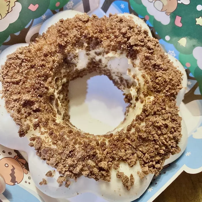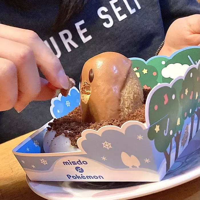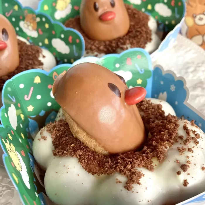ディグダがいなくなった巣穴の方をじっくり見てみると・・・ベースは白いポン・デ・リング。それにカスタードクリームを糊として、土を表したチョコクランチがトッピングされています。まさしく、ディグダが穴から出てきたところを表現していますね!