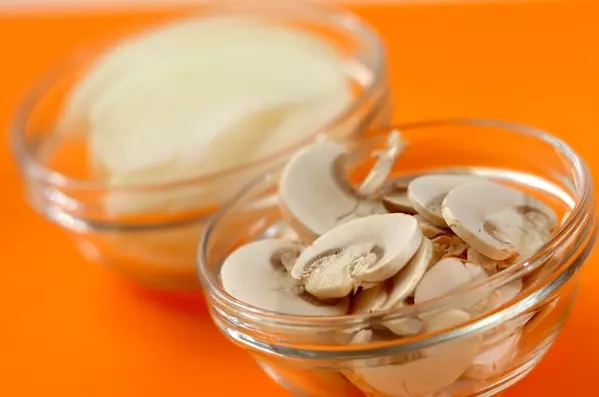 2、玉ネギは縦薄切りにする。マッシュルームは石づきを落とし、キッチンペーパー等で拭いて薄切りにする。
