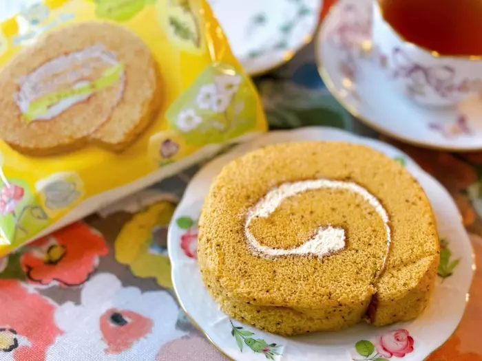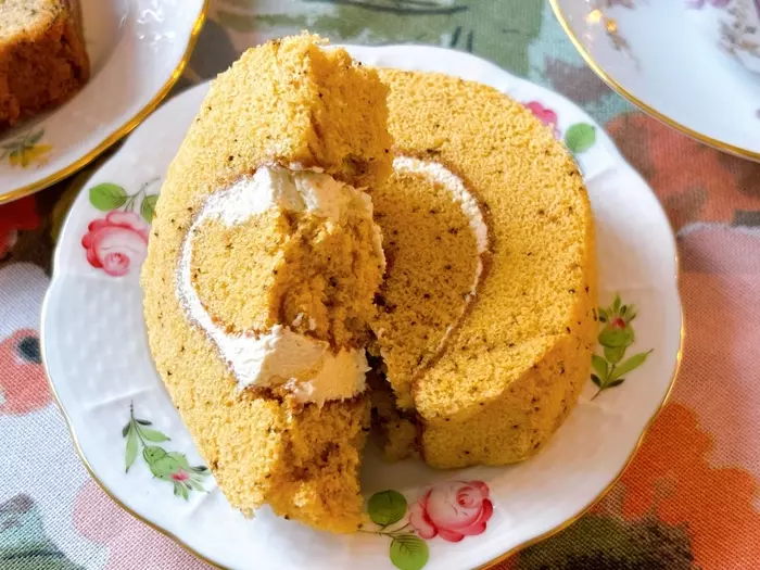 レモンティーだからか、ほのかに黄色味がかった色合いのロールケーキです。茶葉が練り込まれた生地で、おいしそう…!