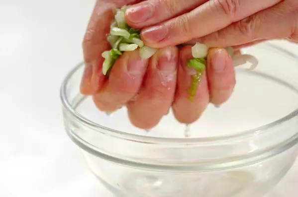 1、白菜は芯と葉の部分に分ける。芯は繊維に沿って長さ4cmの拍子木切りに、葉はザク切りにする。塩でもんで10分程置き、水気を絞る。
