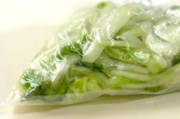1cm幅に切った白菜と塩(白菜の重さの約1%)をポリ袋に入れて揉み込みます。空気を抜きながら袋の口を閉じて冷蔵庫で2時間ほど休ませたら出来上がり!