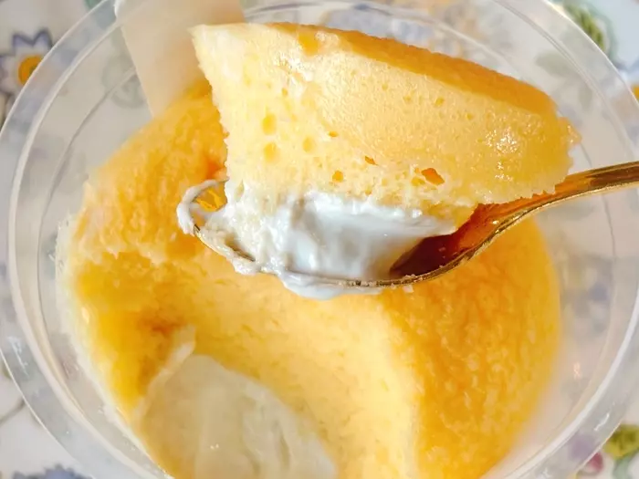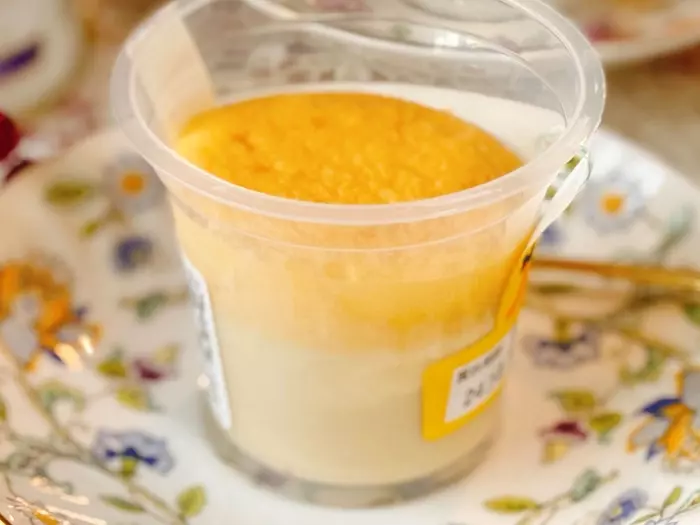 スフレとプリンの間に、とろけるミルククリームがはさまった3層仕立てです。