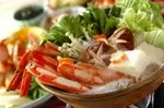 昆布と蟹の出汁で旨味たっぷりな鍋です。色とりどりの具材で見た目も豪華。出汁をとったあとの蟹はポン酢しょうゆと薬味で味わいましょう。最後はご飯と溶き卵を入れて雑炊にすれば、一度で二度おいしいですよ。