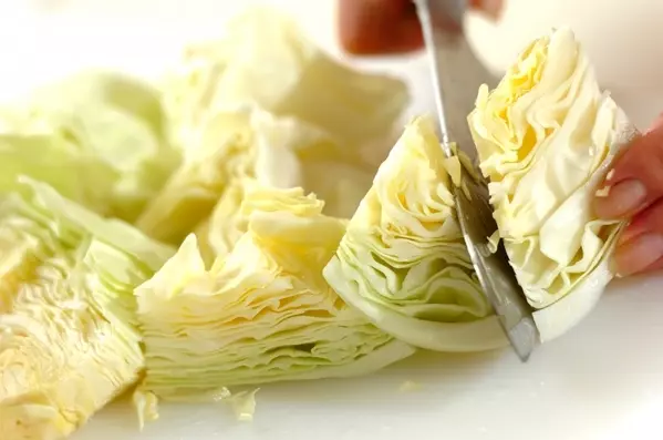 4、白菜は水洗いし、葉はザク切りに芯の白い部分は削ぎ切りにする。