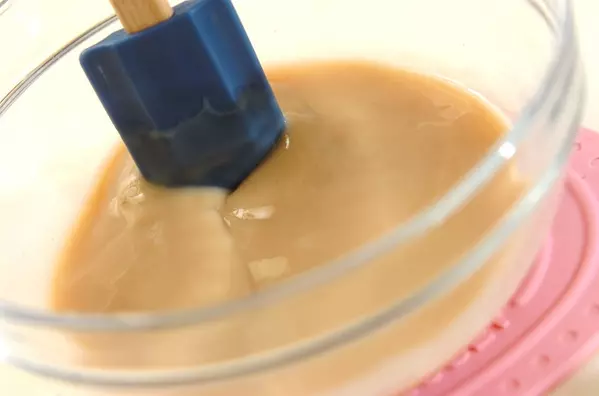 6、(3)はさらに泡立て器でキメを整え、(5)に3回に分けて加え、混ぜる。器に分け入れて、表面をカードで平らに整える。冷蔵庫で1時間以上冷やす。