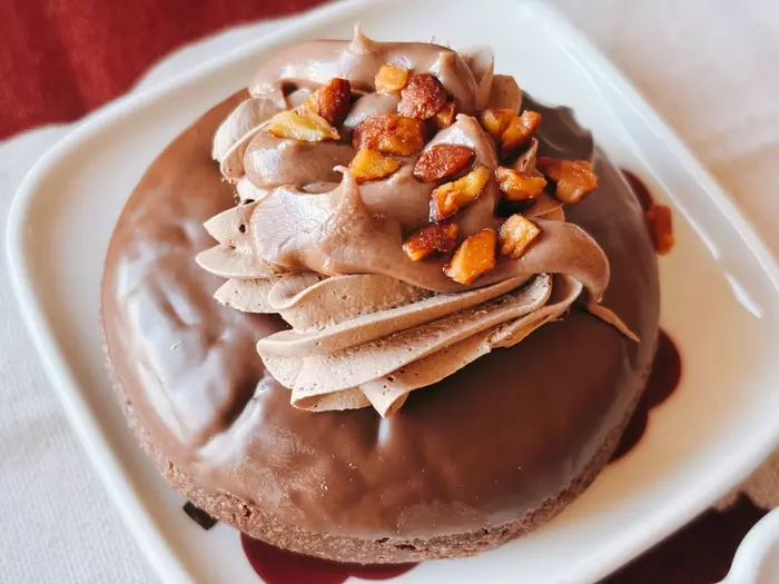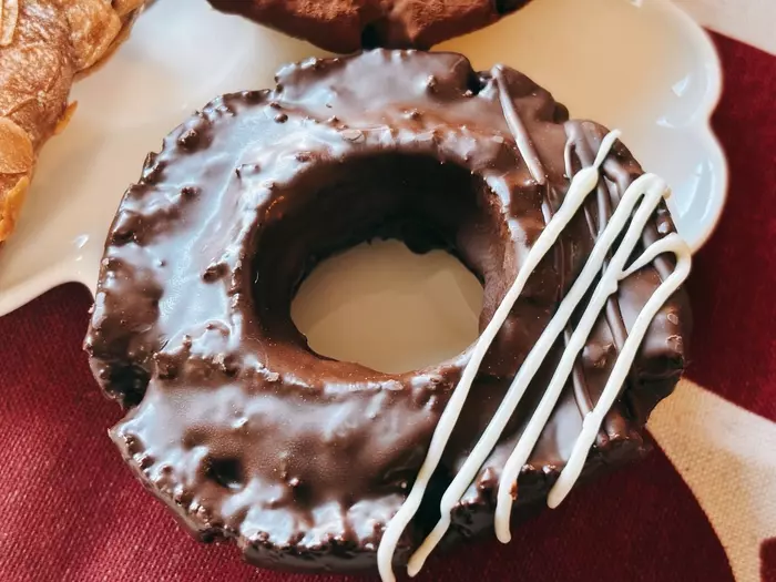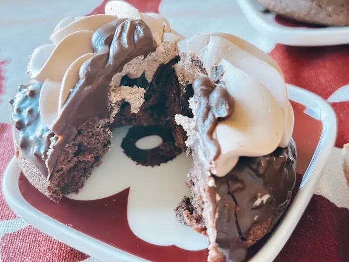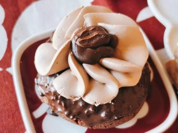 ドーナツ生地とチョコレートのコーティング部分だけを食べると、濃厚なチョコレートの味わいがするのですが、生地のしっとりとした食感がよく分かるバランスの良さに気が付きます。トップのクリームやホイップの主張が強いのと、全体的にバランスがとても良いので、一緒に食べるとチョコレートのコーティングの濃厚さや生地のしっとり感に気づくことなく、サラッと通り過ぎてしまうかもしれません。色んな部分をゆっくり味わってほしいなぁと思いました。