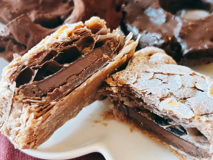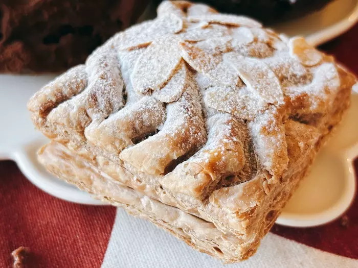 ザクザクと音が良い切れ味です!アーモンドのチョコクリームはクランベリー入りですが、そんなにベリーは感じないので、夫も娘も美味しいと大満足でした。パイ生地とチョコレートの組み合わせは外れないですよね!真ん中の分厚いチョコレートは、ビターですがフルーティな味わいもしてパイ生地に馴染んでいます。アーモンドのチョコクリームは主張せず、板チョコとよく合います。
