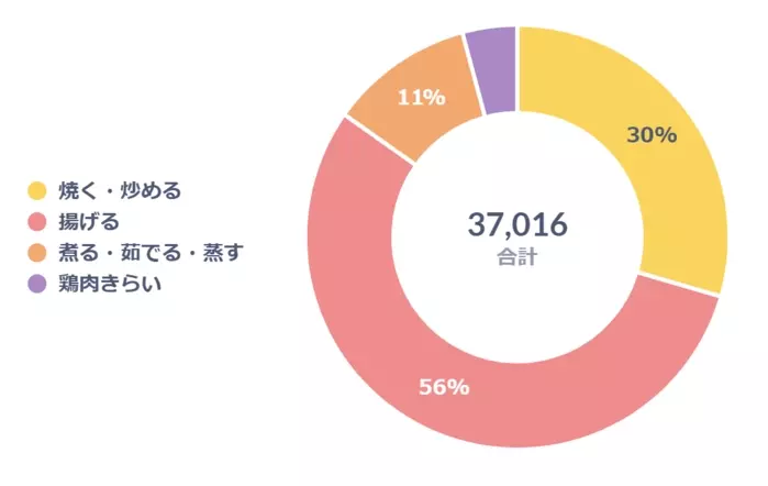 鶏肉の1位は、「揚げる」食べ方がダントツの1位でした! 唐揚げだけでなく、チキン南蛮やヤンニョムチキン、油淋鶏など、唐揚げのレシピはアレンジも幅広くありますね。また鶏肉は手羽先や手羽元など部位によってさまざまなレシピがあります。手羽をお酢で煮たトロトロの煮込みもおすすめですよ。