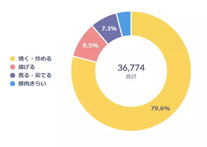 豚肉の1位は、「焼く・炒める」で圧倒的な人気でした。しょうが焼きや回鍋肉などパパっと作れるレシピが多いのも人気の1つですね。最近では、トンカツ用の厚切り肉を焼いて食べるトンテキが話題で、専門店ができるほど人気。ガーリックとしょうゆベースの甘辛いタレでごはんが進みます。こちらのレシピもぜひチェックしてくださいね。