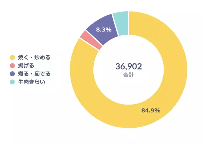 牛肉の1位は、「焼く・炒める」が圧倒的な人気!焼き肉やステーキのみならず、牛こま肉や切り落とし、ひき肉は手軽に使えるためレシピも豊富なのも人気の1つではないでしょうか。牛肉は弱火でじっくり煮込めば煮込むほど柔らかくなります。時間がある時はビーフシチューやビーフカレーを煮込むのもおすすめです。