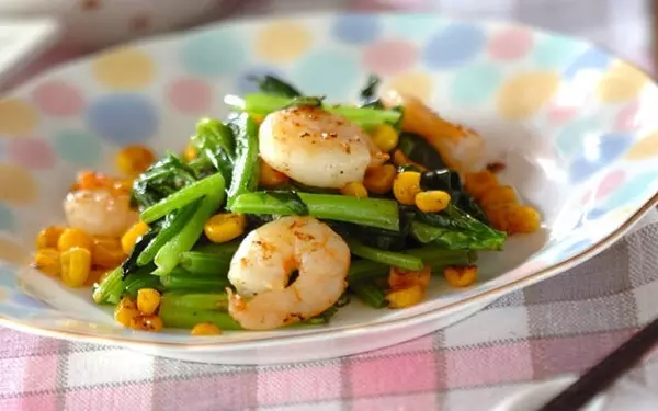 バターに溶け出したエビの旨味がホウレン草にからんで絶品! コーンの甘みとの組み合わせも最高です。むきエビを使うときは、背わたを取り除いてから調理しましょう。明るい色味で、お弁当のおかずにも使える便利な一品です。