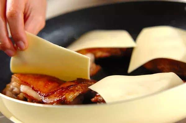 4、鶏もも肉にスライスチーズをのせてフライパンの蓋をし、余熱でチーズが溶けたら、器に盛る。シシトウと白ネギを添えてタレをかけ、お好みで七味唐辛子を振る。