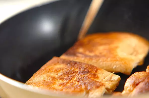 2、フライパンにゴマ油を熱して(1)を両面こんがり焼き、最後にしょうゆを加えて全体にからめる。
