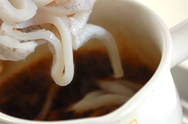 2、再び煮たったら、イカの色が変わる程度にサッと煮て、いったんイカをザルに上げて取り出す。