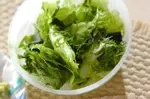 1、レタスは手で大きくちぎって冷水に放ち、パリッとしたらザルに上げ、しっかり水気をきる。