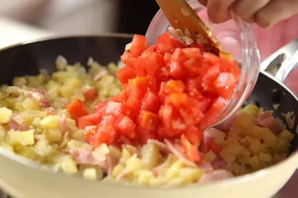 2、全体に炒められたらトマトを加え、塩コショウをしてトマトが少し煮崩れるまで煮込む。