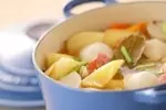 ポトフのスープに、日本の伝統野菜である大根やカブを加えたアレンジです。スープに少ししょうゆを加えることで和風の味わいに。パンはもちろん、ご飯のおかずにもなるマルチなスープです。体を温める食材がたっぷりで、ヘルシーなのも魅力。和ポトフ風スープ