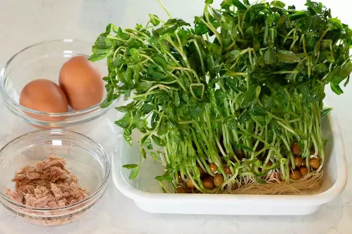 1、豆苗を3cm幅に切る。ゆで卵は食べやすい大きさに切る。