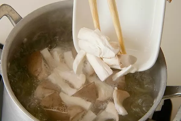 2、エリンギは石づきを切り落とし長さを2~3等分に切り、縦4~6つに裂く。