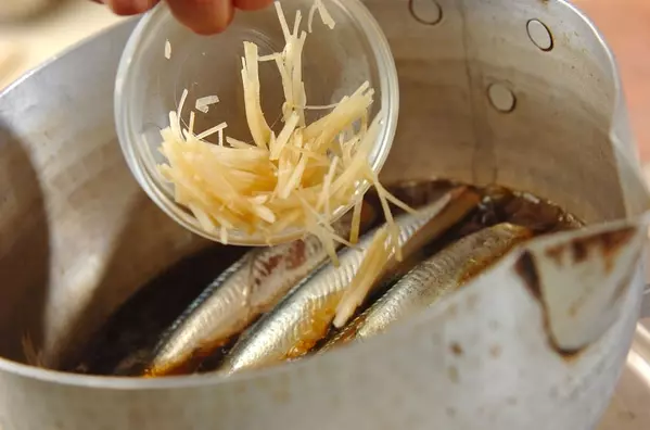 1、ホウロウ、またはステンレスの鍋に<合わせだし>の材料を入れて強火で熱し、煮たったらイワシ、梅干しを入れる。再び煮たったらアクを取り、ショウガを加えて落とし蓋をする。