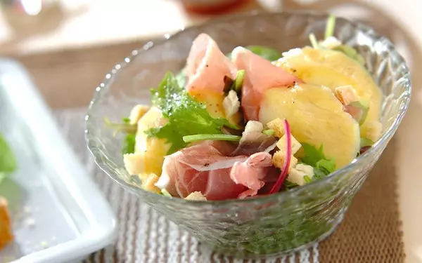 マンゴーはサラダに活用しても絶品。生ハムの塩気とよく合い、ワインが進む一品です。風味の強い食材を使っているので、オリーブ油とビネガーだけのシンプルドレッシングが、素材の味を引き立てます。