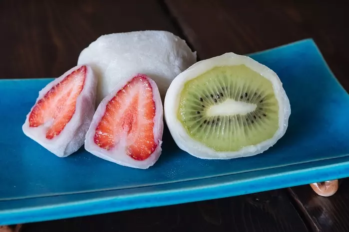求肥はフルーツやあんこと相性抜群です。見た目も美しく、食べるとフワッと溶けるような感覚に。イチゴ白玉