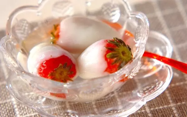 イチゴを丸ごと白玉で包んで、つるんとジューシーに。これを求肥で包めば、なんちゃってフルーツ大福の完成です。イチゴのほか、ブドウ、みかん、キウイなど多彩なフルーツでアレンジできます。冷やして食べても良いですね。