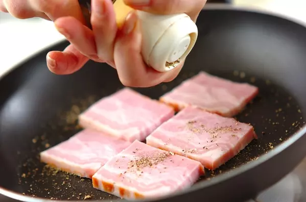 1、ベーコンは幅7~8mmに切る。フライパンに黒コショウをミルでひきながら振り、ベーコンを並べる。もう一度ベーコンに黒コショウをミルでひきながら振る。
