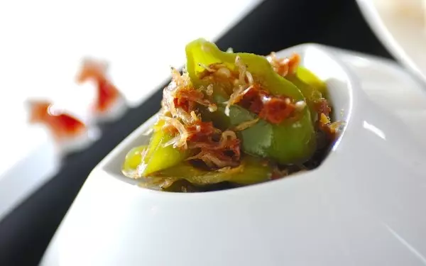 万願寺とうがらしとジャコの組み合わせは鉄板! ゴマ油で炒めたら、甘辛く煮詰めていきます。ご飯の上にのせるほか、混ぜ込んでおにぎりにしてもおいしいです。