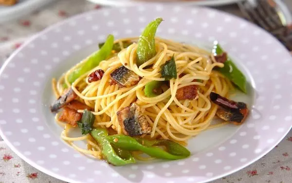 万願寺とうがらしはオイル系パスタと相性抜群! ニンニクの風味や赤唐辛子の辛みが効いて、イワシ独特の臭みは気になりません。万願寺唐辛子はシャキッとした食感を活かすため、サッと加熱する程度でOKです。