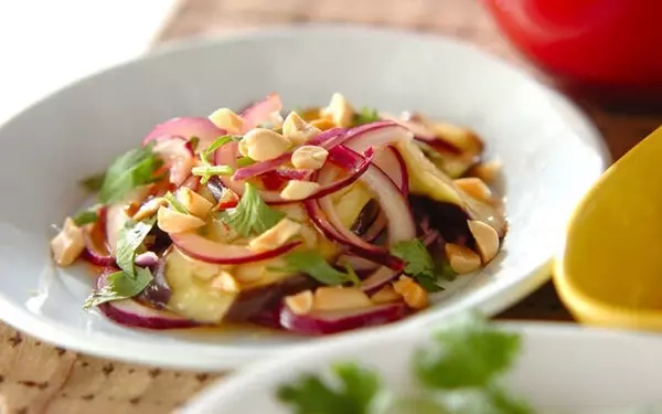 鮮やかな紫玉ネギの彩りが目を引く、サラダです。スイートチリソースをベースにしたドレッシングで、エスニック気分が味わえますよ。とろけるような口当たりのナスに、ピーナッツのカリッとした食感がアクセント。おもてなしにもおすすめです。