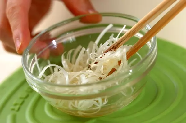 2、白髪ネギに<調味料>の材料を加えてからめる。
