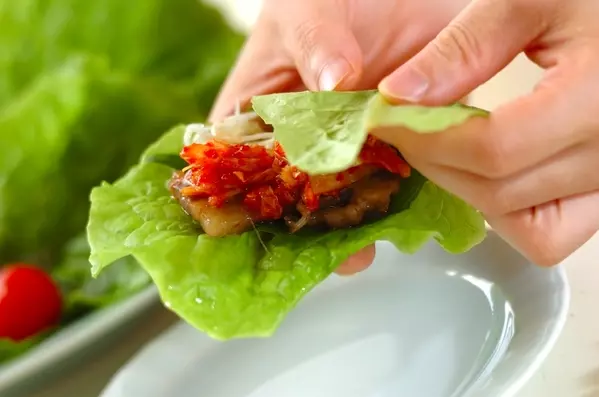 3、器に(1)と(2)、白菜キムチ、サンチュ、大葉、プチトマトを盛り合わせる。サンチュで巻いて召し上がって下さい。