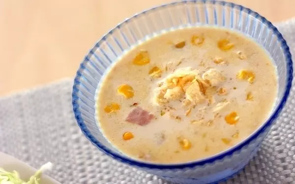 旬の甘いとうもろこしで作る、子どもに好評な冷製スープです。玉ネギやベーコンと一緒に炒めて甘みをしっかり引き出すのがおいしさの秘訣。ミキサーにかけず、つぶつぶ感を味わいましょう。砕いたポテトチップスのカリカリ感が良いアクセントになります。