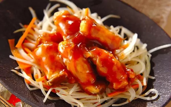 素揚げ野菜とカリカリに揚げた豚肉を、甘酢ベースの調味料に漬け込みます。一口頬張るとジュワッとしみ出す甘酸っぱさが絶妙! 箸がどんどん進むおいしさです。後味はあっさりしていますが、ガッツリとした食べ応えです。