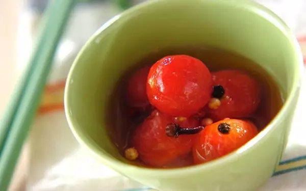 湯むきしたミニトマトで作るピクルス。冷蔵庫でよく冷やしてから食べると、爽やかな一品に。ジュワッとあふれだす果汁と、ショウガ&クローブの風味のコラボがたまりません。小瓶に詰めれば、ちょっとした手土産にも喜ばれそうですね。
