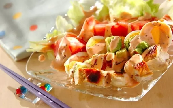 サラダのドレッシングにオーロラソースを使うと、おしゃれな雰囲気を楽しめます。こんがり焼いた鶏むね肉やゆで卵などの淡泊な食材と、コクのあるソースが好相性。カラフルな見た目が華やかで、ホームパーティーにもぴったりです。