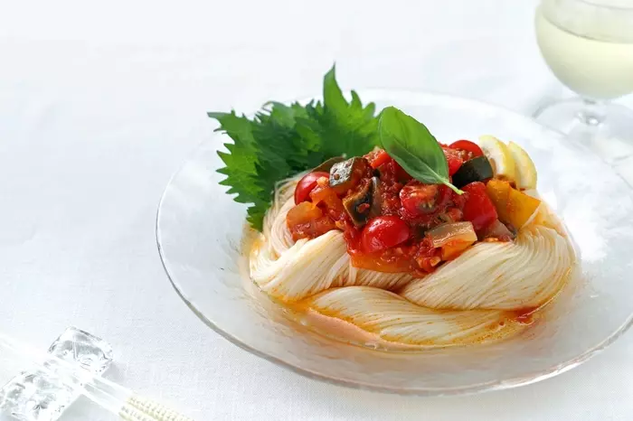 1、素麺はかためにゆでてしっかり水洗いし、水気をきる。