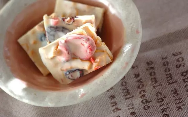 ホワイトチョコにミックスベリーを混ぜ込み、冷やし固めるだけの超簡単レシピです。ミックスベリーはフリーズドライしたものを使うので、サクサクと軽い食感。コーンフレークやナッツを一緒に入れてアレンジするのも◎です。