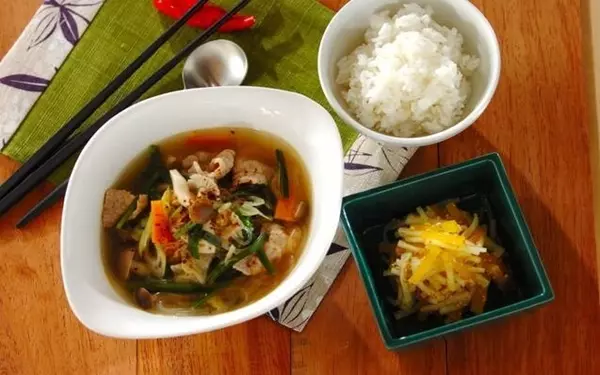 根菜をふんだんに使った酒粕入りのスープは食べ応え抜群。栄養豊富で代謝を助けるツルムラサキの和え物を添えることで、ダイエットに役立つ献立が完成します。スープは作ってから時間をおくと、味がなじんでおいしさがアップ。