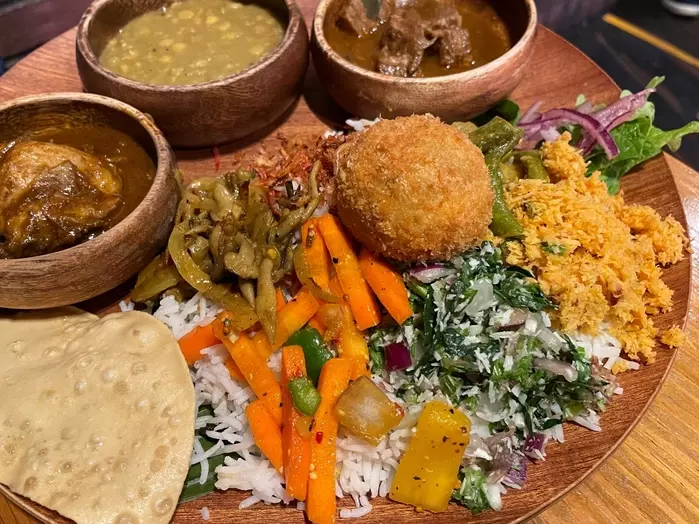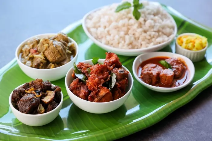 インドのカレーと比べると油分は控えめで、さらりと軽やかな口当たり。 野菜や豆、魚、チキンなど具材ごとにカレーを作り分け、それぞれを別々に盛り付けて少しずつごはんに混ぜながら食べるのが一般的です。