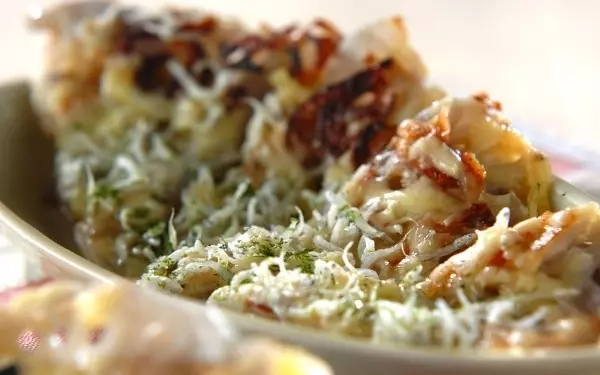 薄切りレンコンを広げて、ピザ生地にアレンジします。片栗粉をまぶすことで生地がまとまり、両面カリッと焼き上げましょう。粉チーズ+シラスの塩気がレンコンの甘さを引き立て、お子様も夢中になるおいしさです。