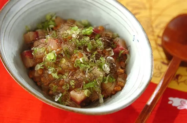 ピリッとした練りワサビが味の決め手。はまちの刺身と納豆をサッと和えるだけで、ごはんにもおつまみにもぴったりの一品に。のりで巻けば、香りと食感のバランスが抜群になります。