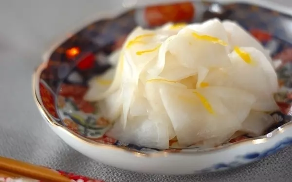 漬物の定番、甘酢漬けにレモンの爽やかな香りをプラス。白と黄色のコントラストが食卓に彩りを添えます。やさしい甘さなので、和食はもちろん、カレーや丼ものの付け合わせにも最適です。