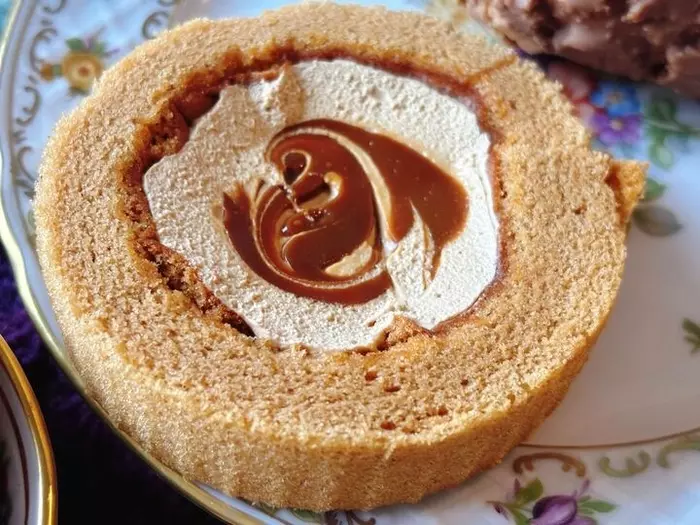 スポンジふわふわ!キャラメルのビターな味わいが、生地だけでなくクリームやソースからも味わえます。ビターさを追求したロールケーキですね。全体的に、ほのかなキャラメルの甘みも後から感じられますが…。