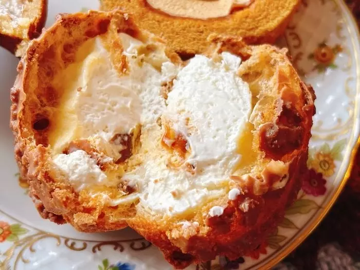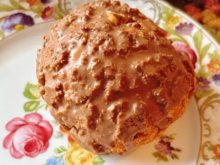 表面がゴツゴツとしたクッキーシューです。キャラメルでコーティングされているみたいです。中がどうなっているのか楽しみです…!
