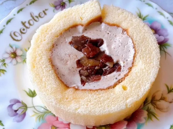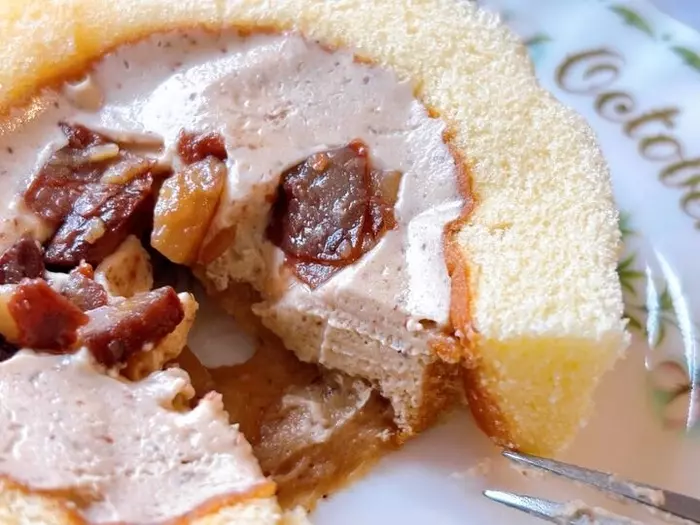 渋皮栗のダイスカットに栗のホイップクリーム、さらに濃厚なマロンクリームでまさに栗尽くしのロールケーキです。食レポを紹介します!